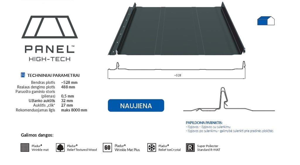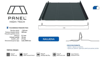 Technologinės naujovės kiekvienoje srityje leidžia realizuoti jūsų norus ir poreikius. HIGH-TECH plokštė yra geriausias to įrodymas. Tai stogdengių, rinkos lyderių ir „Blachotrapez“ ekspertų šiuolaikinio bendradarbiavimo rezultatas. Ji iš naujo apibrėžia stogo plokščių su užlanku formą ir jų montavimą. Tai yra pažangiausia rinkoje prieinama technologija - ji patenkina drąsius ateities projektus įgyvendinančių stogdengių, architektų ir projektuotojų lūkesčius.
