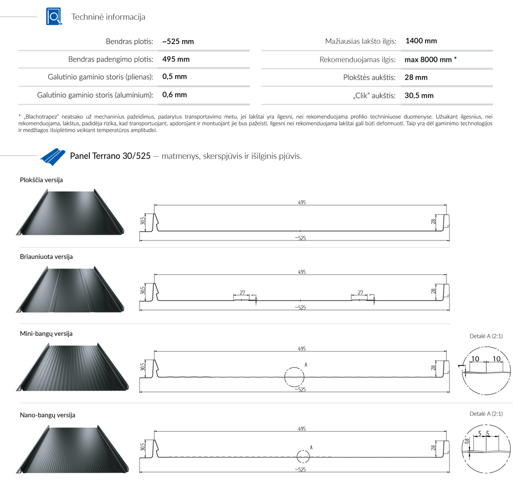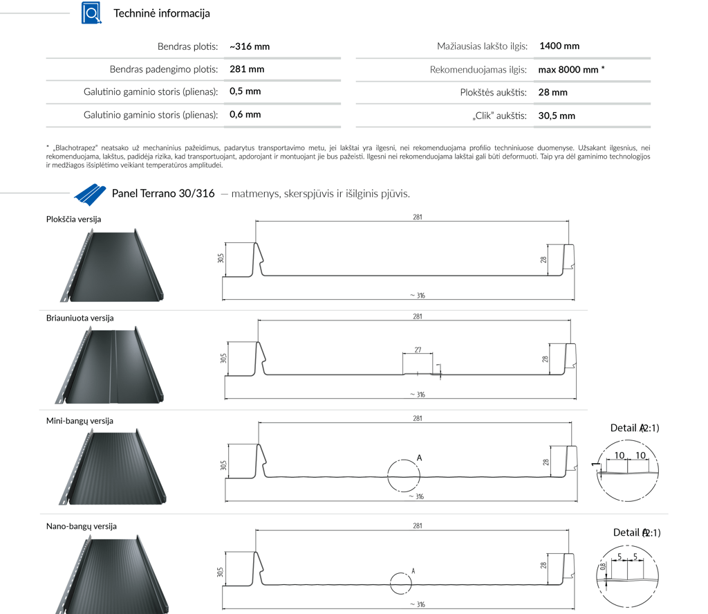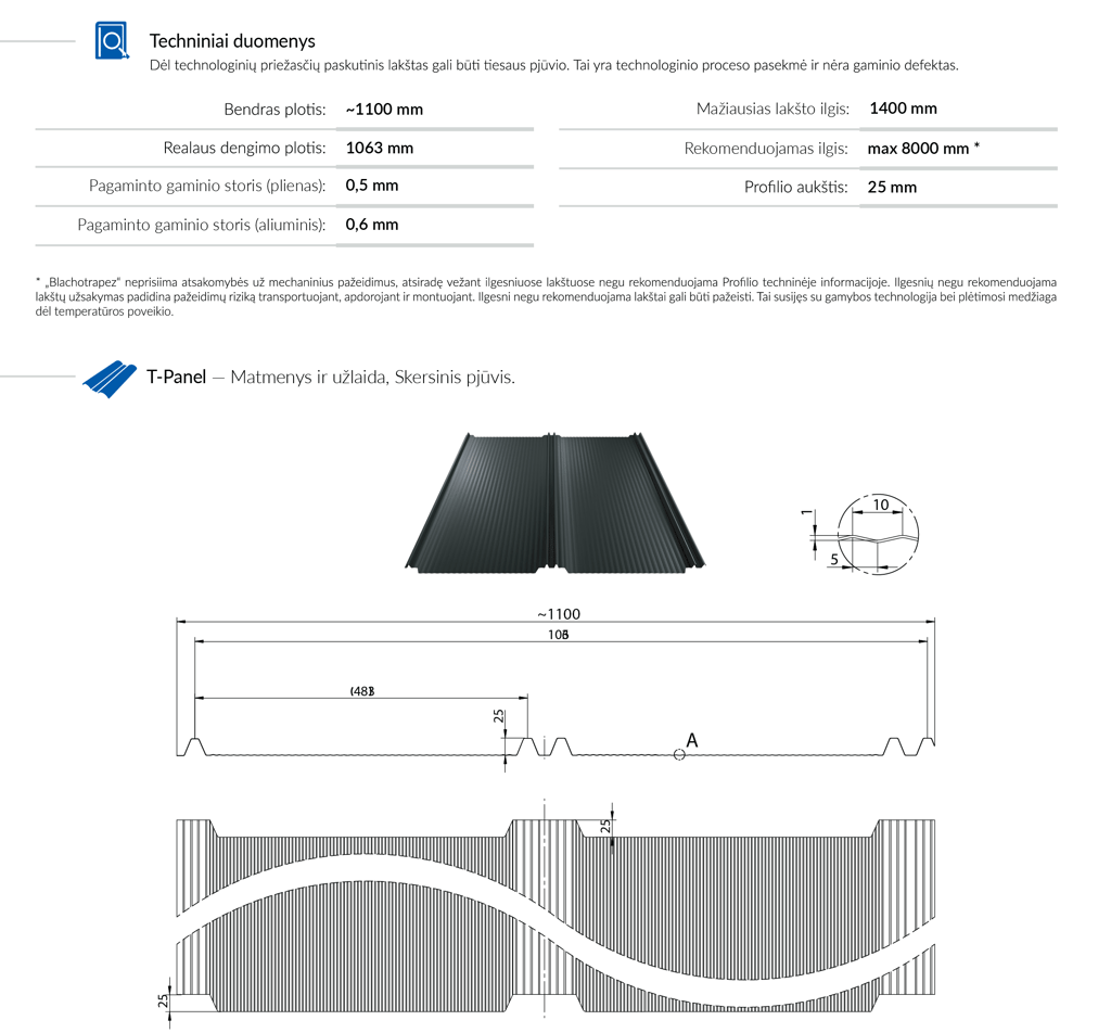 Dvigubi žemos trapecijos formos iškilimai imituoja užspaudžiamą užkaitą, taip sumažindami varžtų matomumą. Sujungimo vietose optiškai paslepiami varžtai, esantys tarp dviejų trapecijų. T-Panel paviršius gali būti lygus arba su nano bangelėmis. Nano bangelių technologija sumažina apkrovų keliamą riziką ir suteikia puikų vizualinį efektą. Produktai gali būti su PREMIUM klasės dangomis, turinčiomis ilgiausią rašytinę patvarumo garantiją rinkoje – iki 60 metų. Tai techninio ir estetinio stogo ilgaamžiškumo garantija.